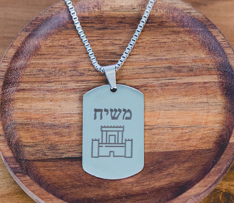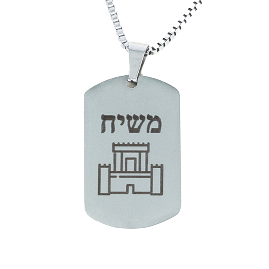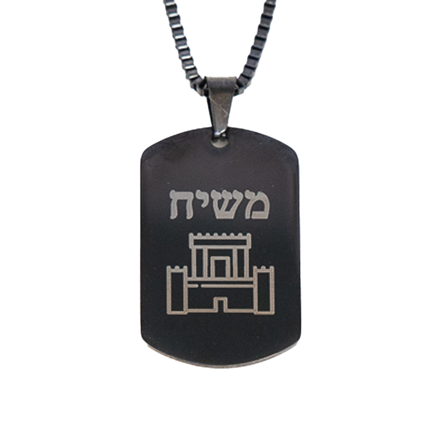 Our new Temple Mount tag necklace features the same bold design found on our popular Temple Mount patches and lapel pins: a silhouette of the Jerusalem Temple paired with the Hebrew word “Mashiach” (Messiah).