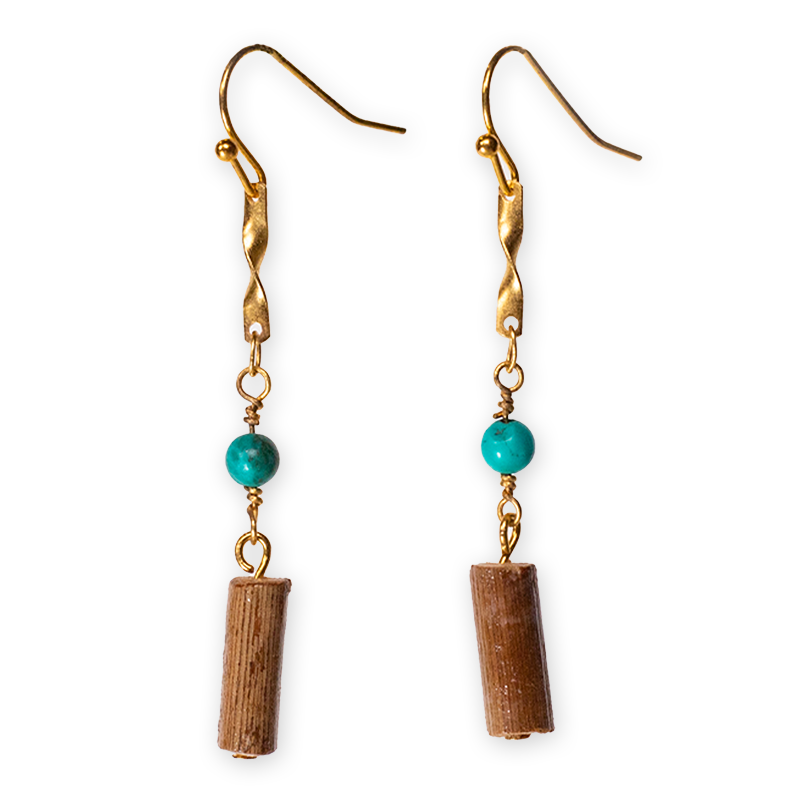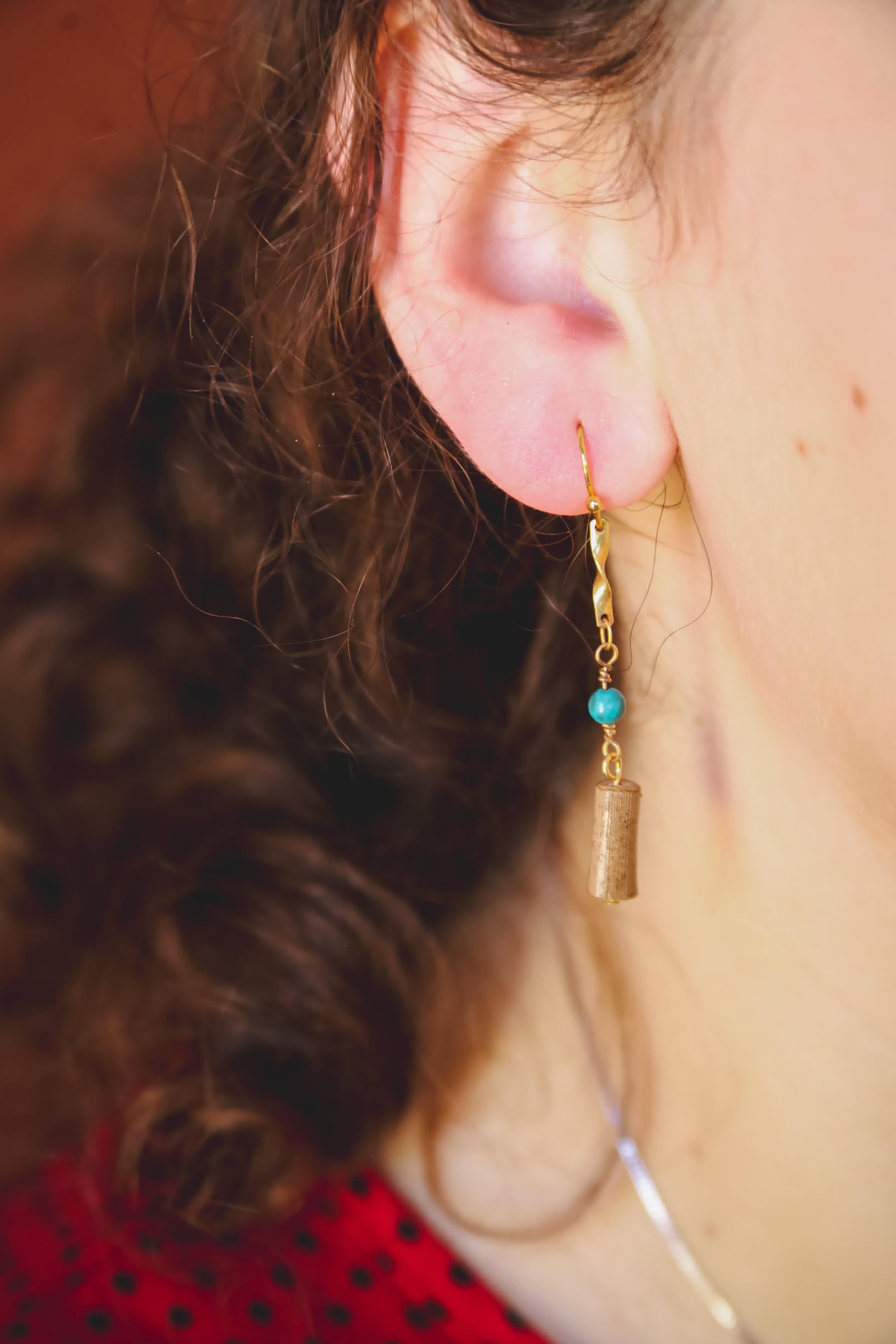 A classy set of earrings with a twisted gold top elegantly complimented by a turquoise orb and preserved piece of grapevine branch.